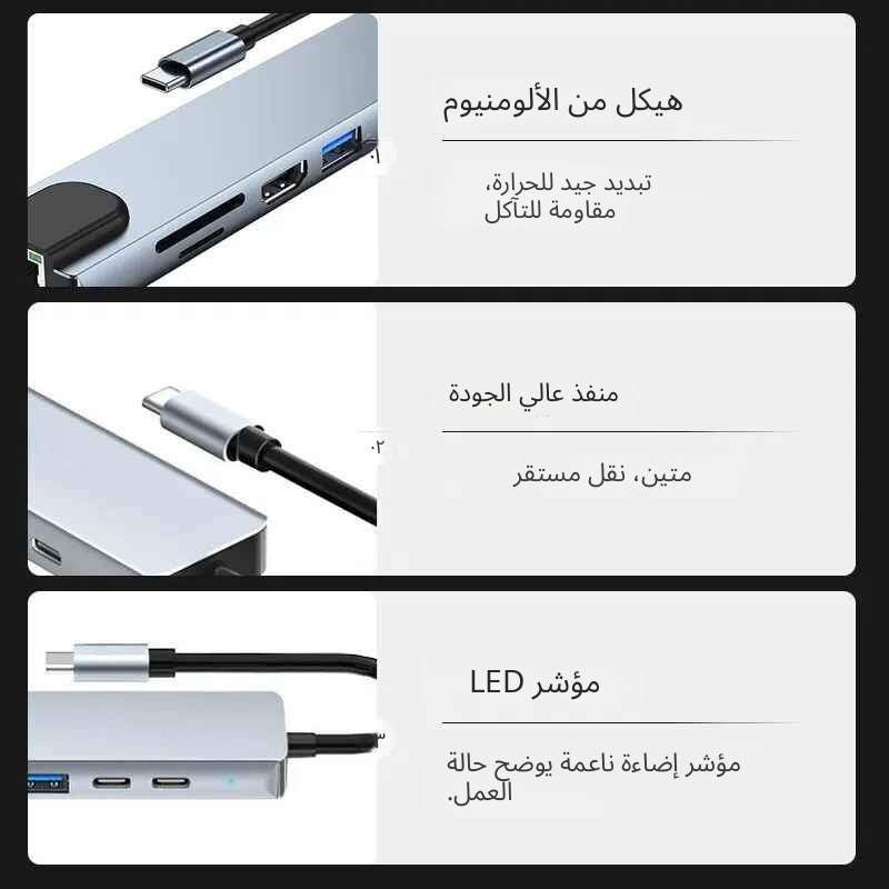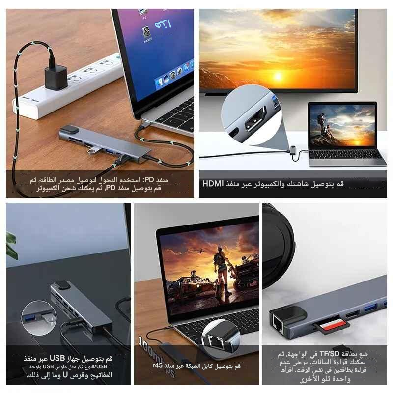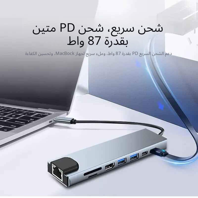 حوّل منفذ USB-C الواحد في جهازك إلى 8 منافذ عملية مع محول 8-in-1 المتوافق مع الحواسيب المحمولة، الأجهزة اللوحية، والهواتف الداعمة لـ Type-C.