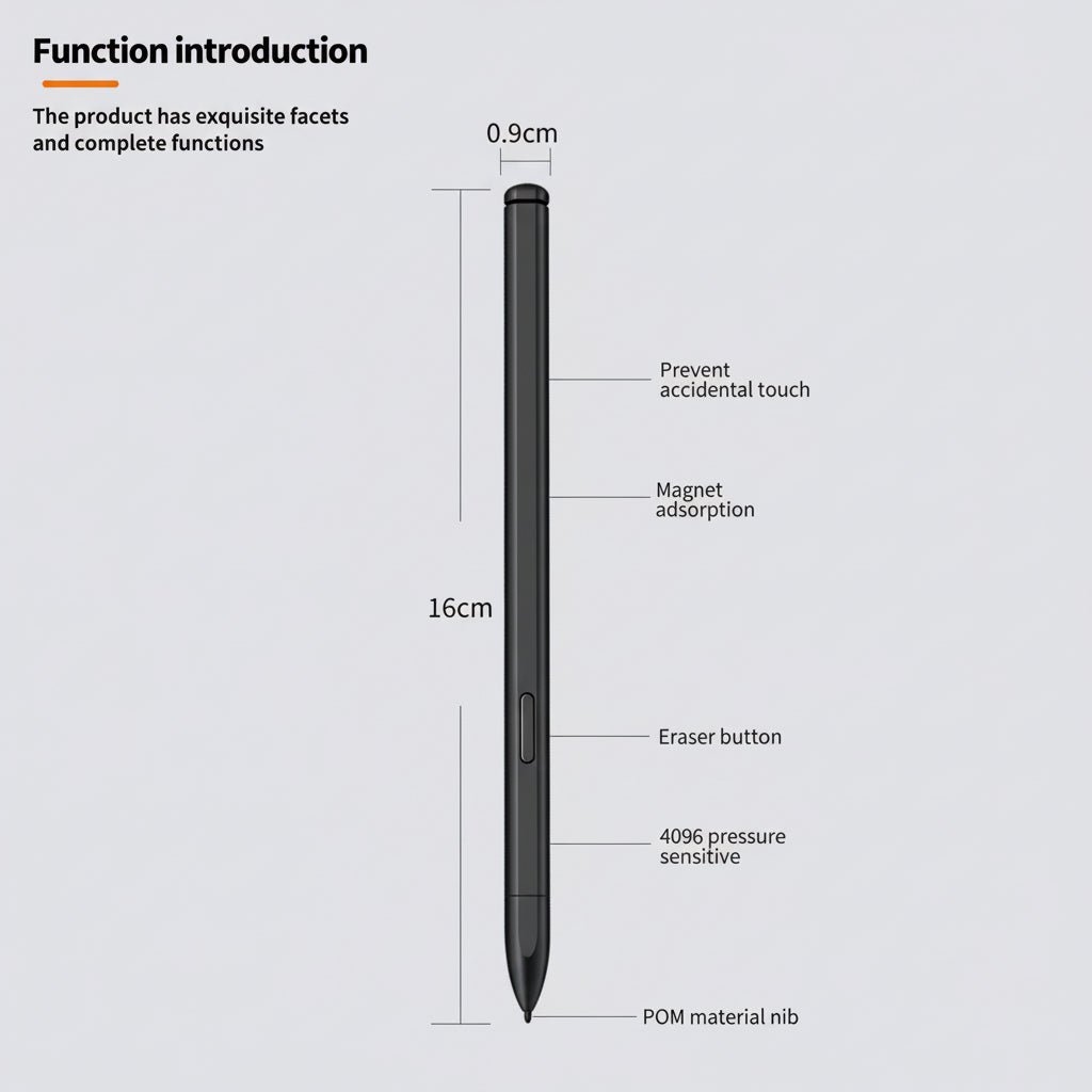 قلم احترافي بدون بطارية، حساس للضغط (4096 مستوى)، مع رأس POM عالي الجودة وميزة Palm Rejection.